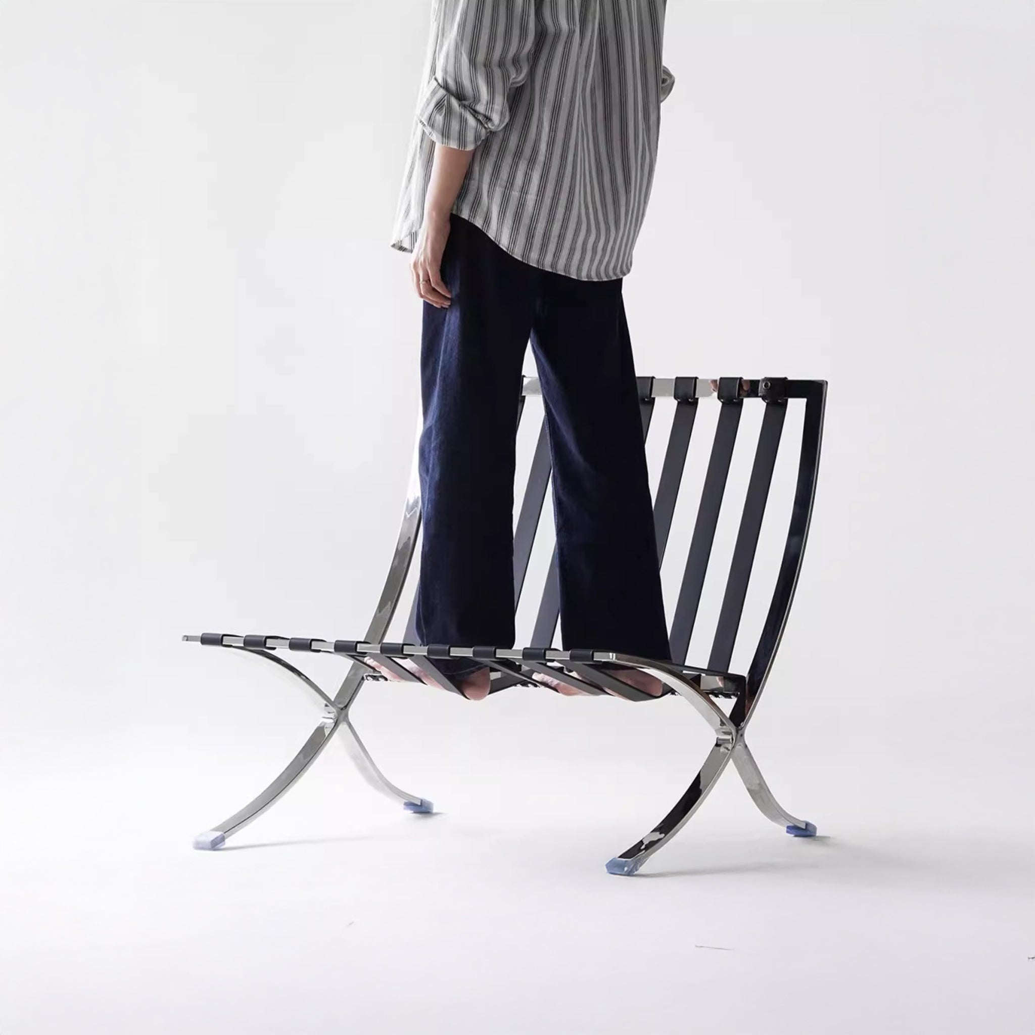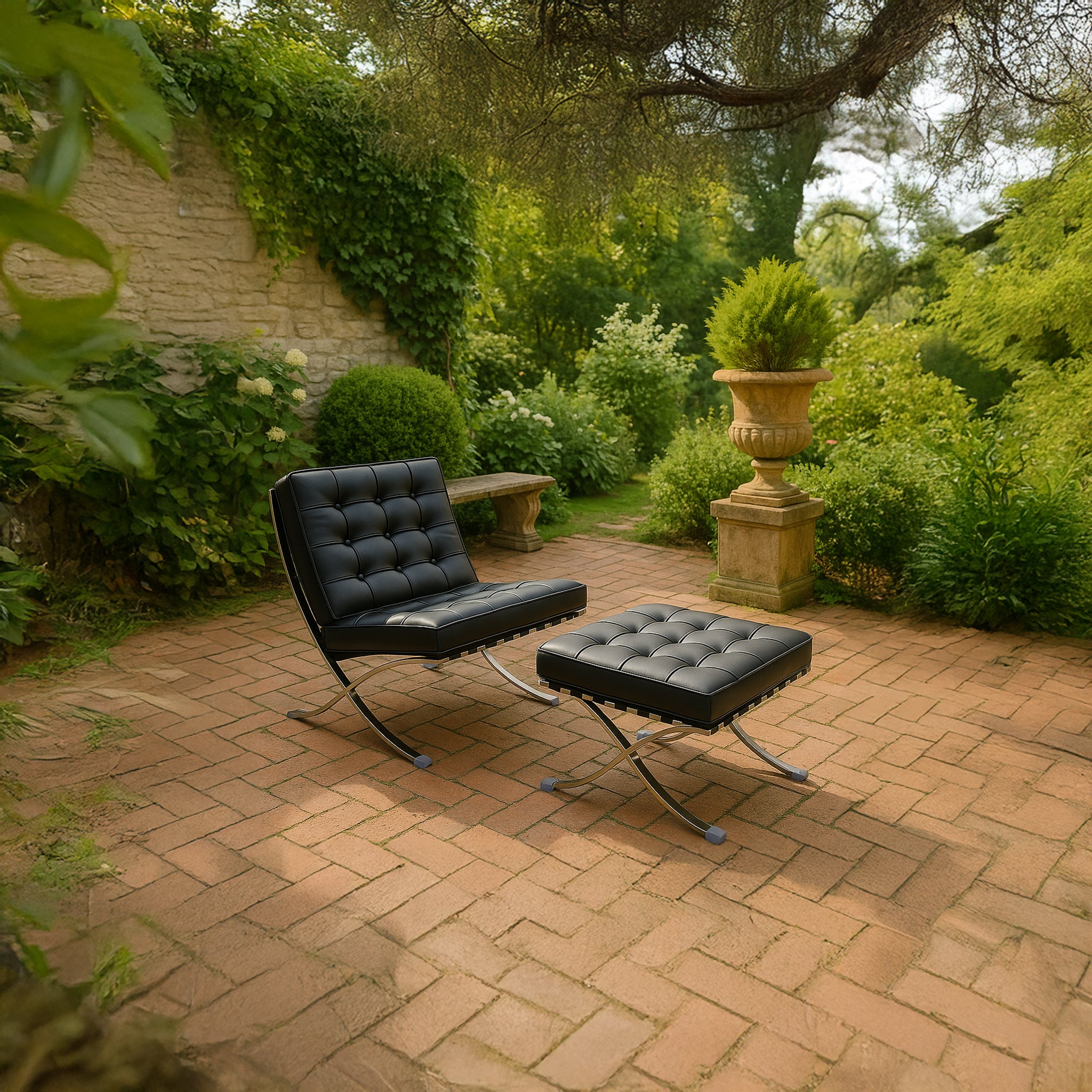 Elevate the aesthetics of your home with this armchair and footstool set, a perfect blend of craftsmanship and timeless design. Inspired by European modernism, each curve is a statement of character, each seam a promise of refinement. Genuine cowhide leather on the contact surface envelops the generously tufted seat, while the chrome frame creates an airy, sculptural silhouette.
